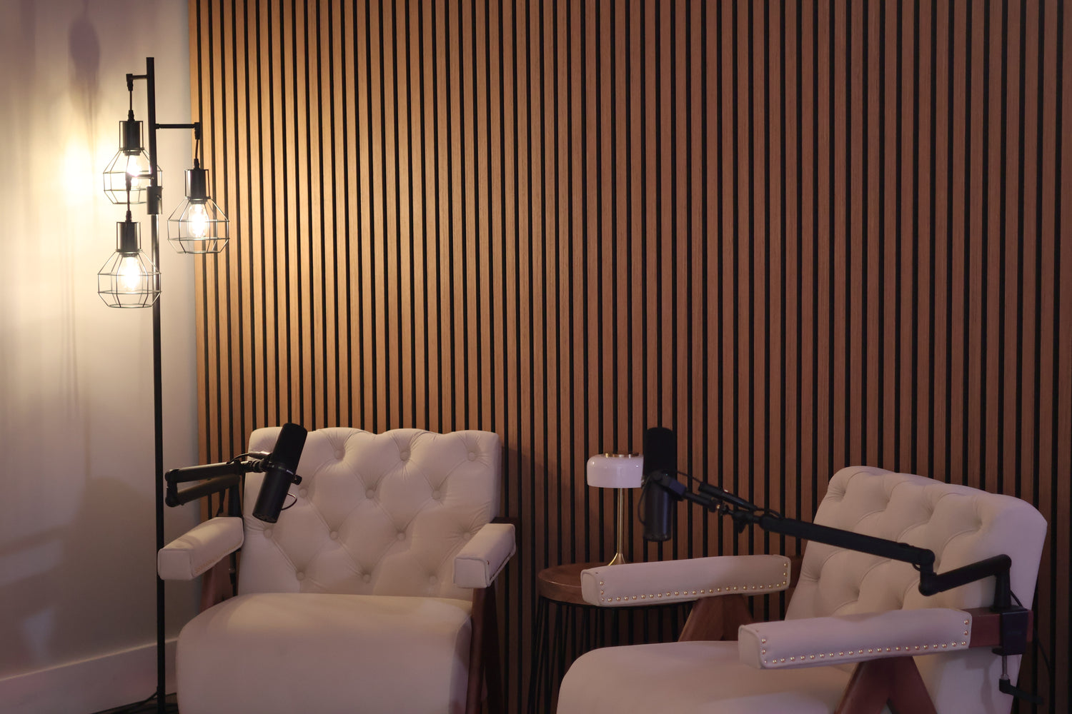 A clean, elevated podcast environment featuring warm wood textures, vertical slat walls, and professional microphone setups. Ideal for: